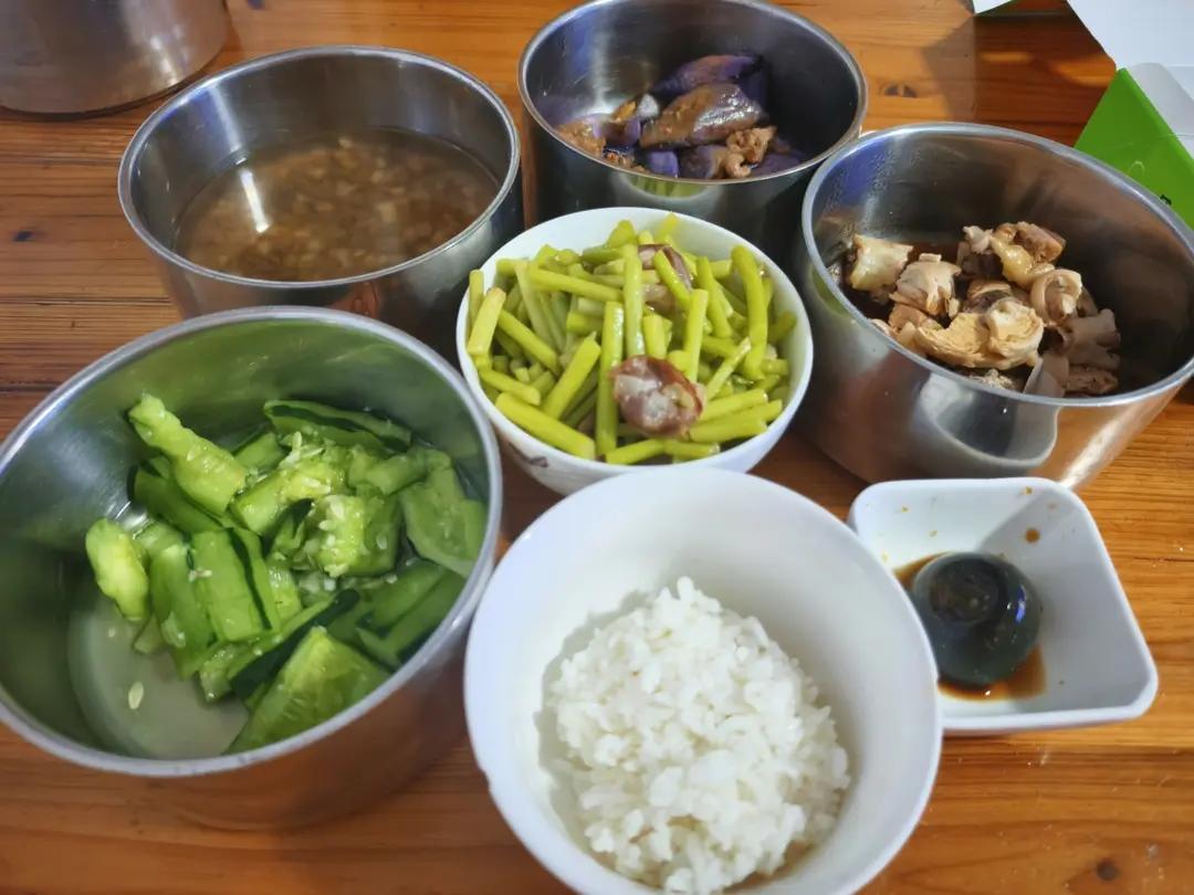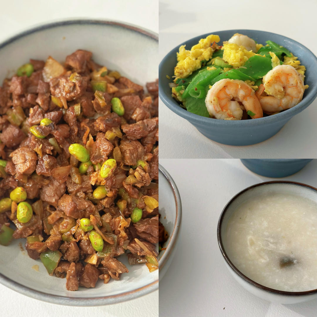 随手拍一张,牛肉粒烧毛豆+鸡蛋虾仁炒莴笋+皮蛋粥。蓝色小碗...