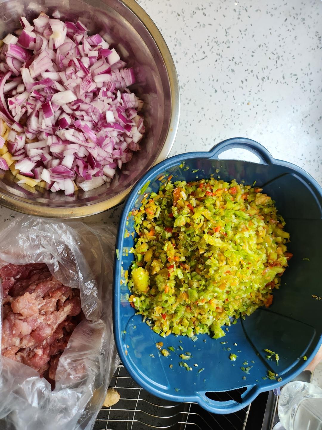 一个洋葱,二十几个辣椒,一大勺子肉沫