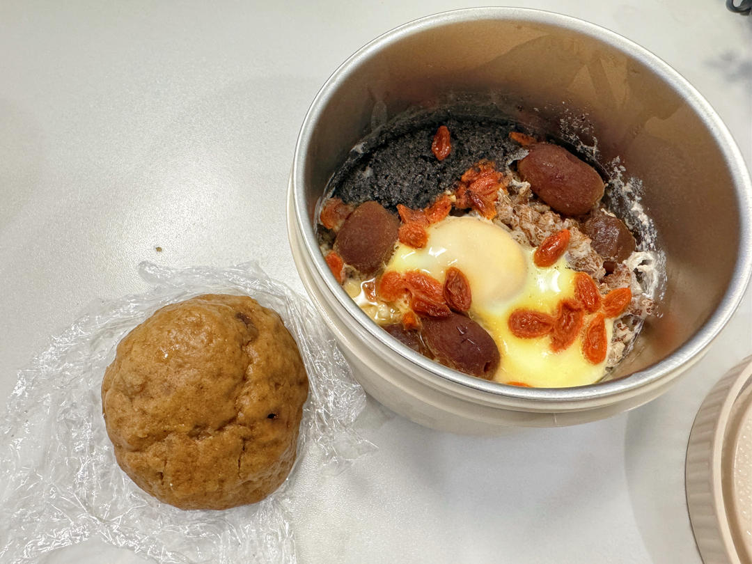 今天酒酿蒸蛋加了麦片和黑芝麻粉,还加了些水。