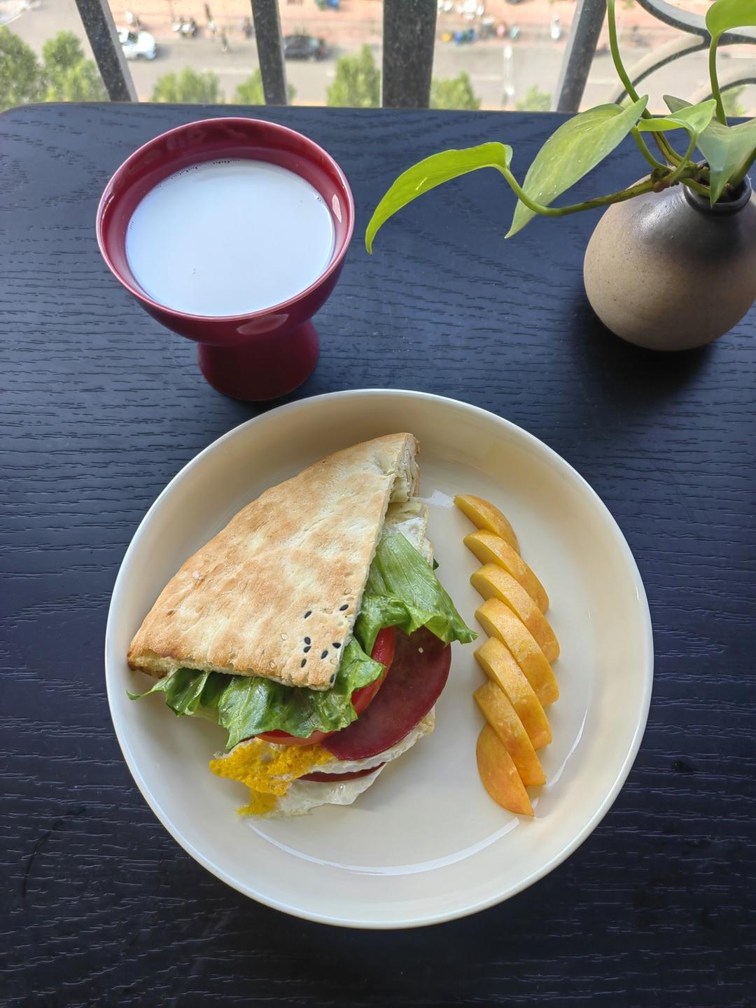 牛奶🥛+鸡蛋夹饼🌮+黄桃🍑