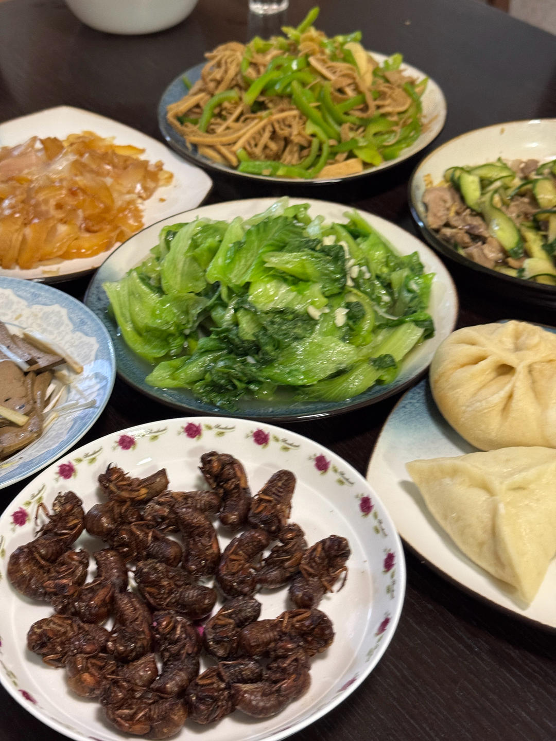 🍀表哥来家,晚上正好包的猪肉豆角蒸包、糖三角,青椒炒牛百叶、拌羊肝、牛蹄筋、香炸金蝉、...