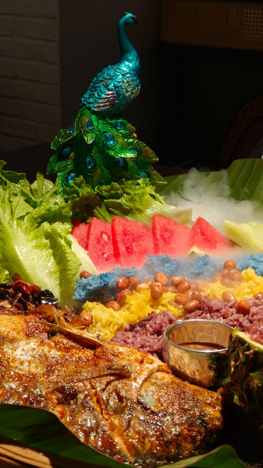 烤罗非鱼,烤五花肉,柠檬干巴丝,火腿炒菌子 菠萝糯米饭 烤洋芋 三色饭,泡鲁达……