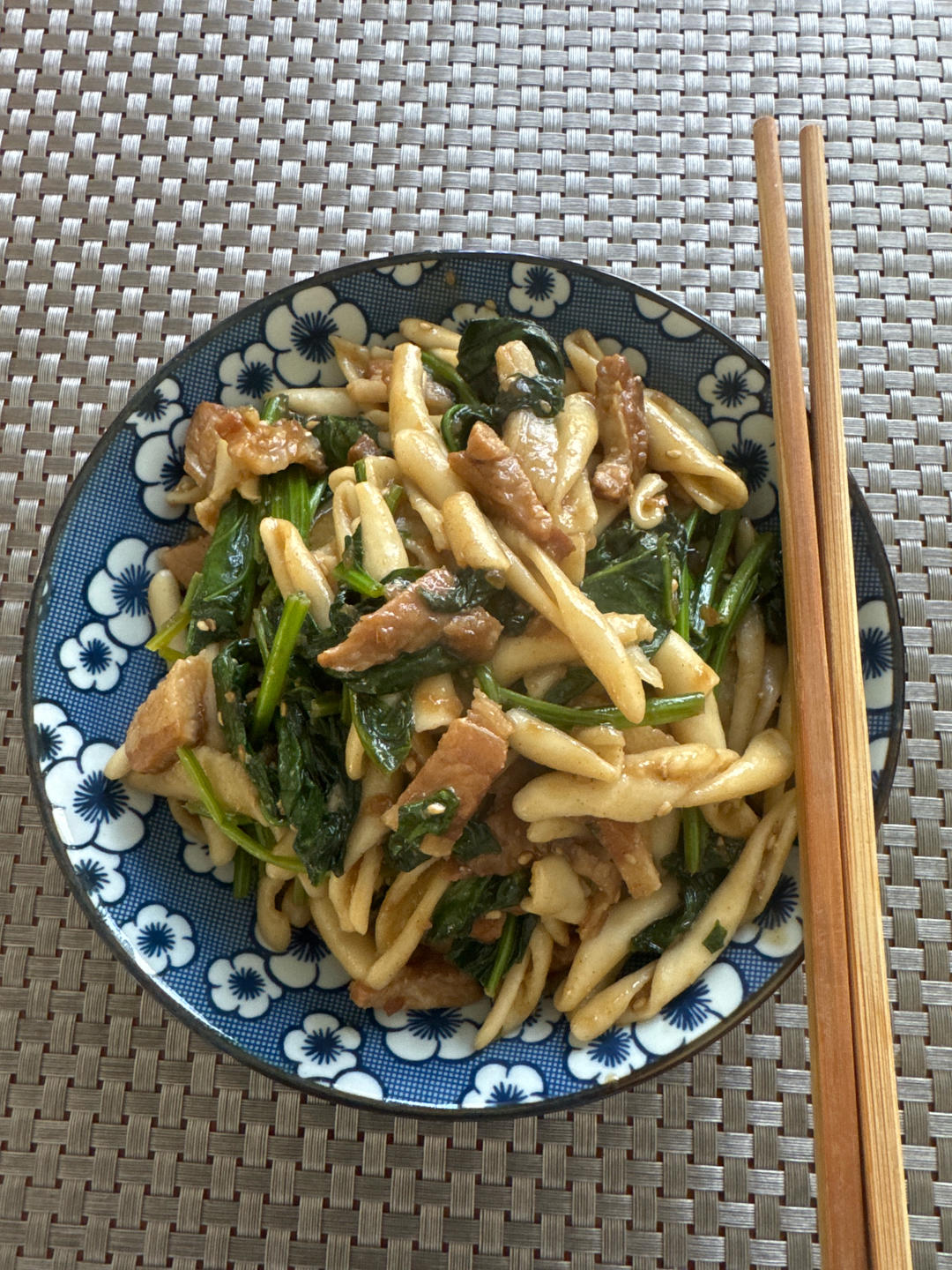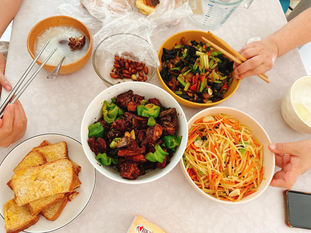菠菜肉条意面+黄瓜拌腐竹+味增茄子毛豆+杂粮粥。意面是家人的主食,我吃杂粮粥。觉得自己蛋白...