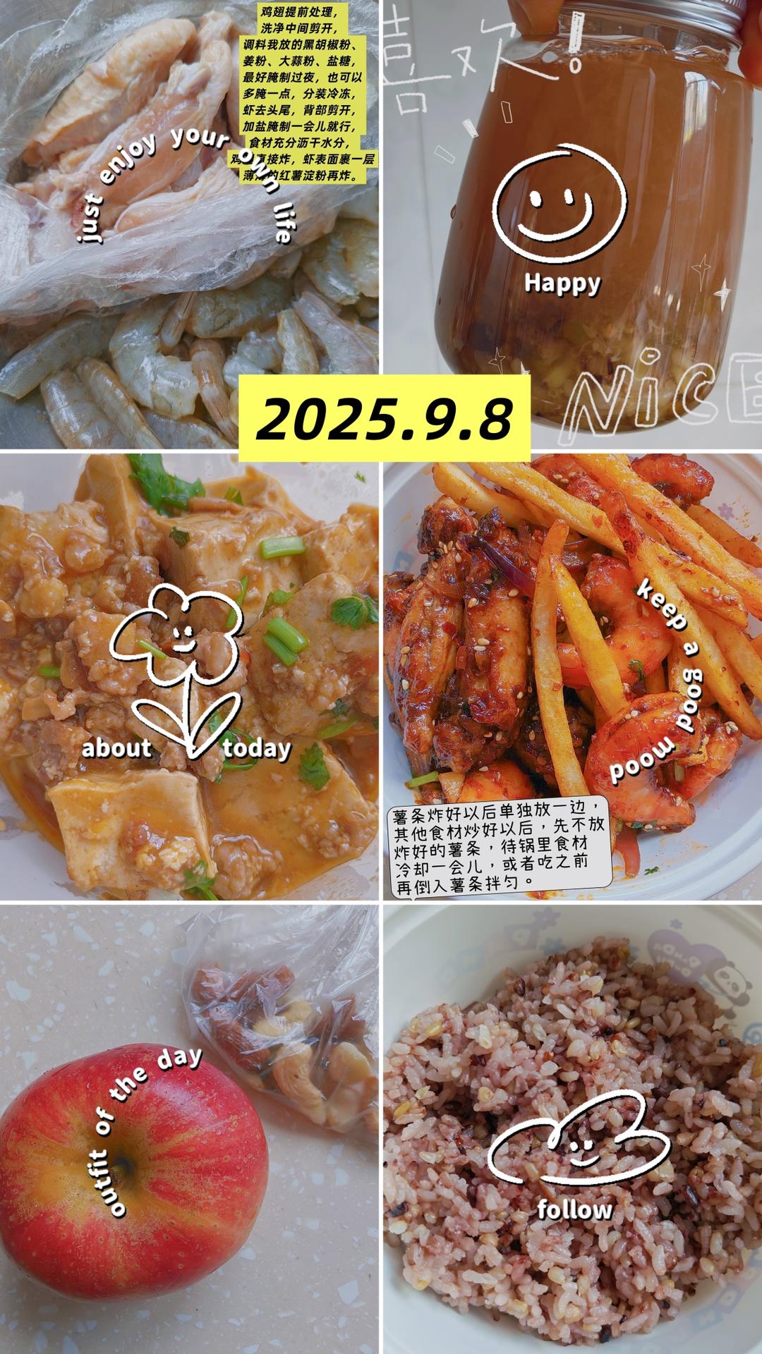 补几张高三生午餐,2025.9.8~杂粮饭+干锅鸡翅虾+麻婆豆腐+银耳绿豆汤+坚果+嘎啦果...