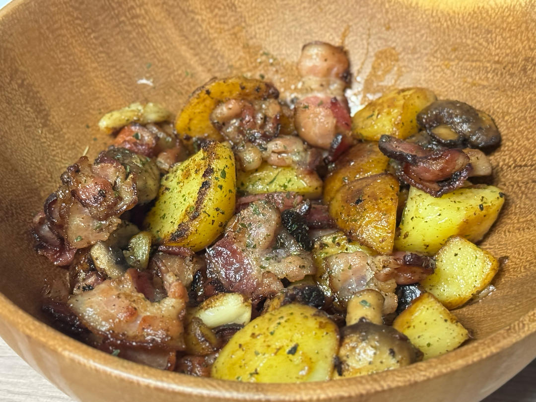 好久没做过地中海菜系,但是熏肉比较便宜所以这次尝试了xhs一个培根蘑菇煎土豆,意料之外地特别好吃!💪💪