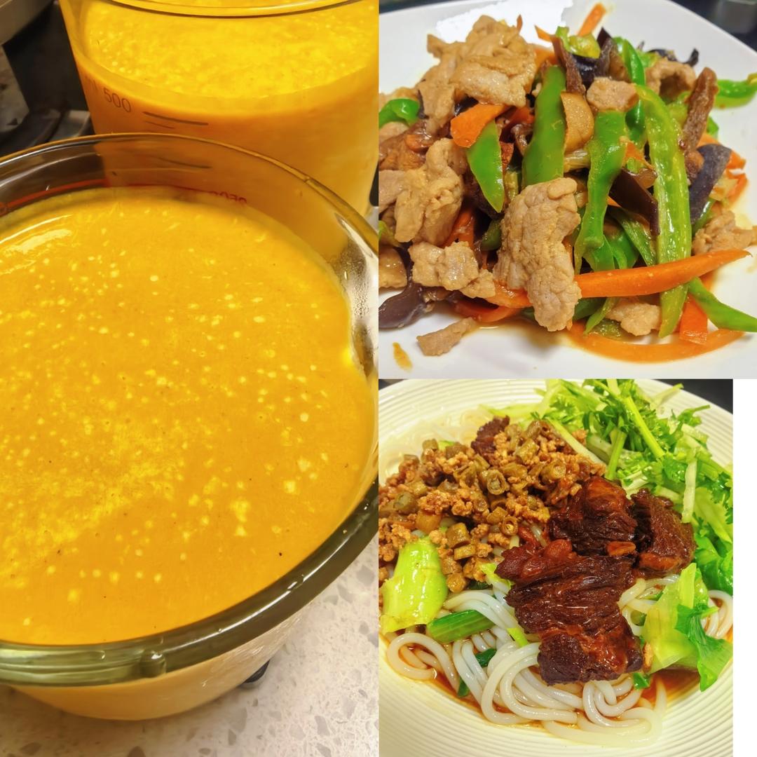 20250928 晚餐:辣椒肉片(蘑菇木耳胡萝卜丝)牛肋条酸豆角拌粉,南瓜牛奶糊。