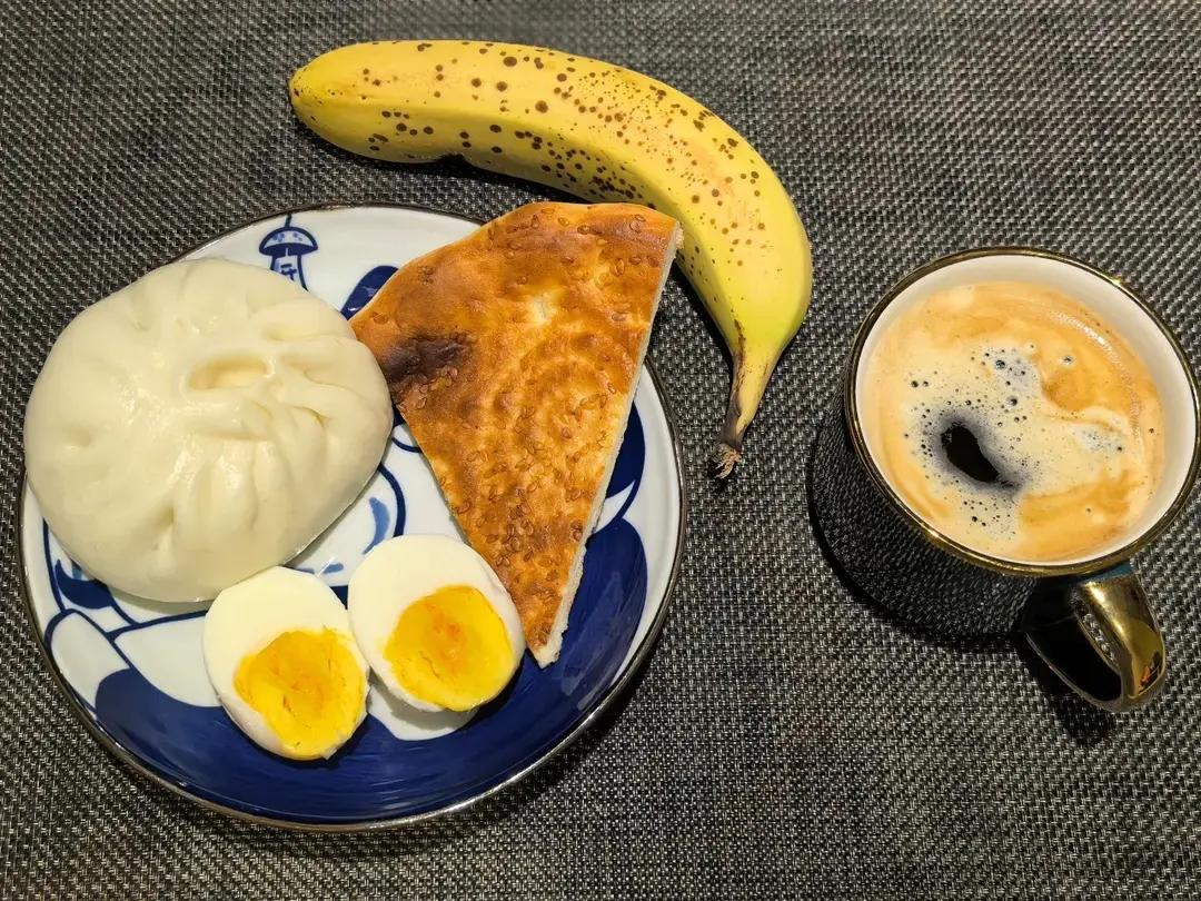 今天整个简单的中西结合→香菇菜包+馕+鸡蛋🥚+香蕉🍌+美式☕