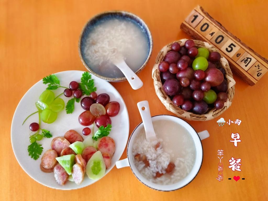 今儿的早餐是一碗板栗粥,搭着黄瓜、香肠、水果~嗯,就是这样简单~