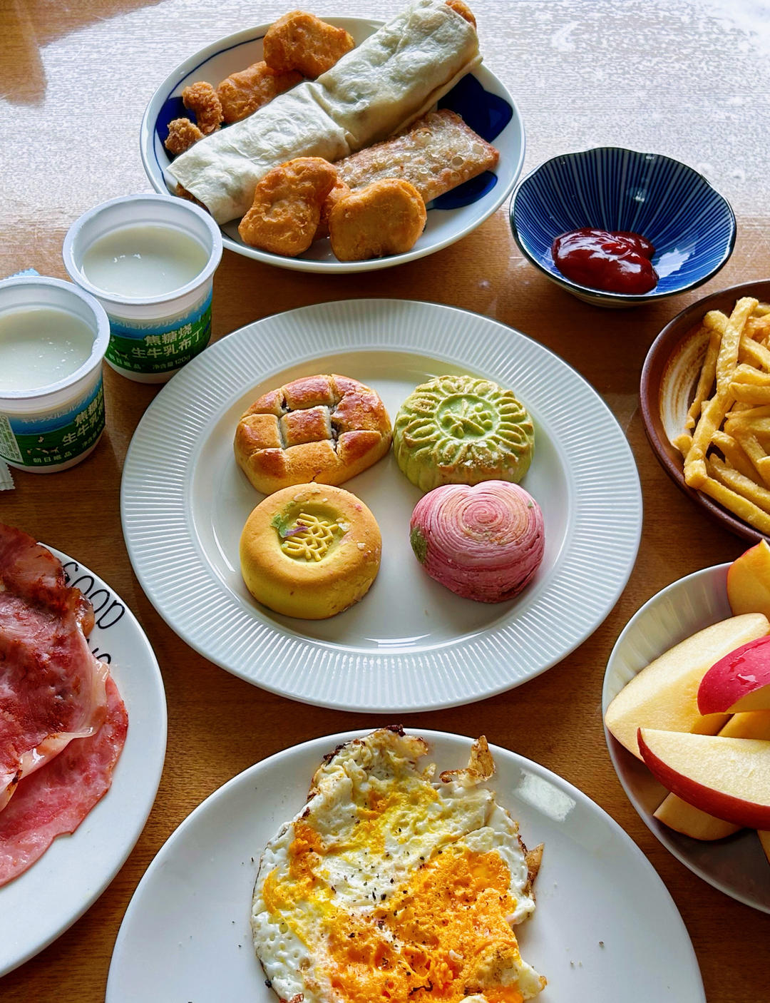 今日早餐:娃的KFC套餐,稻香村果子,煎火腿,煎蛋,苹果,焦糖布丁