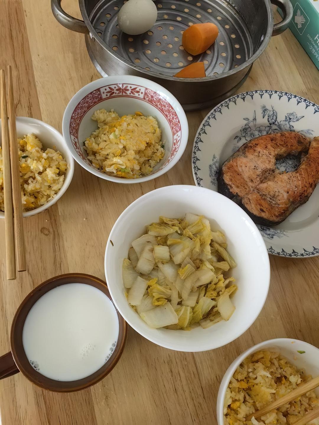 今天的早餐,三文鱼,蛋炒饭,娃娃菜,红薯,鸭蛋,鸡蛋,牛奶