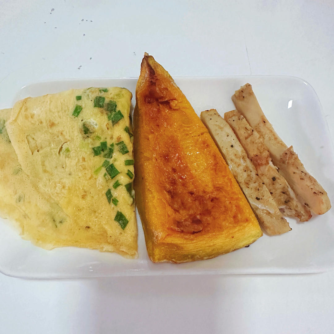 香葱蛋饼、烤南瓜、鸡胸肉