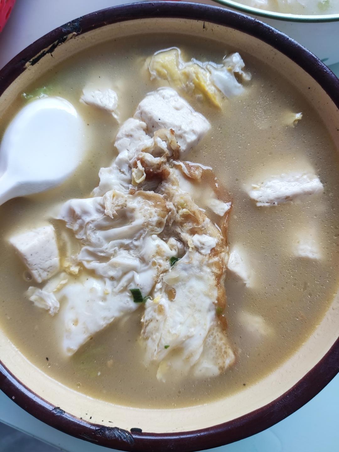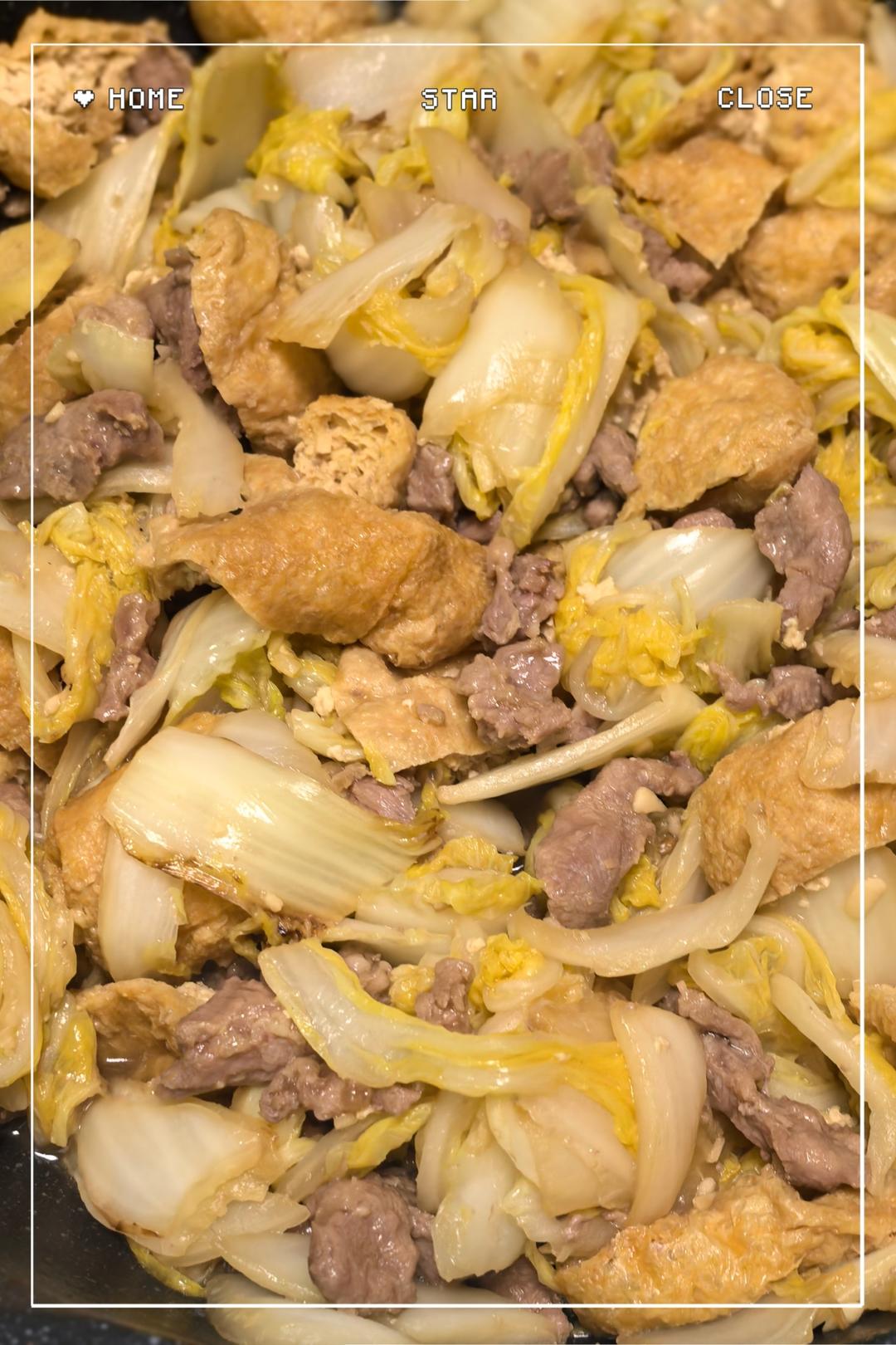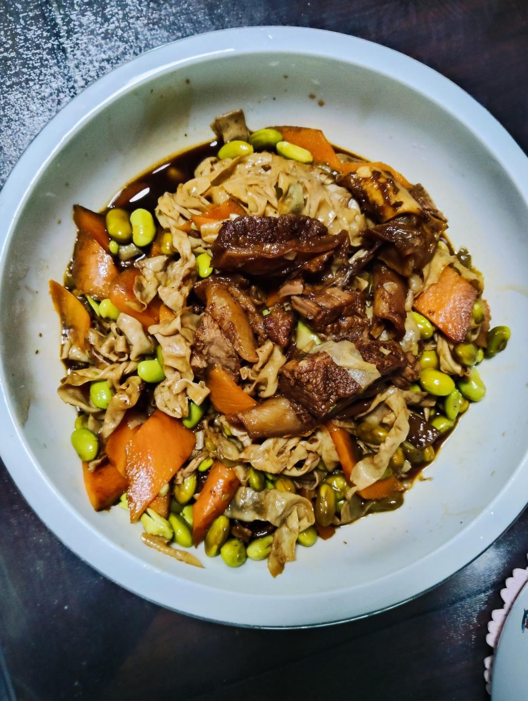 红烧牛腩烩毛豆豆皮。