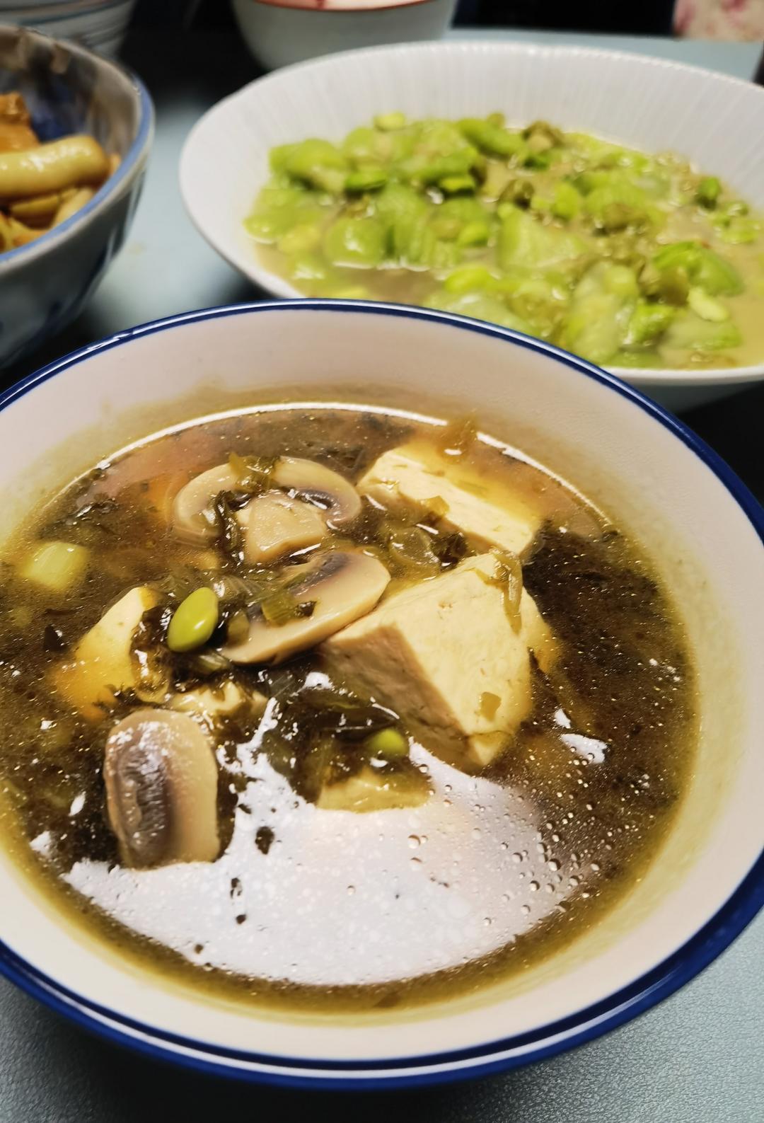 我还放了一点白口蘑和青毛豆。最后的香菜没放吧。