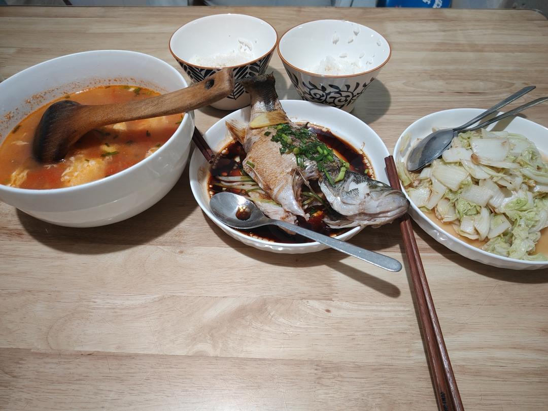 10.17~清蒸鲈鱼~清炒娃娃菜~番茄蛋汤!
