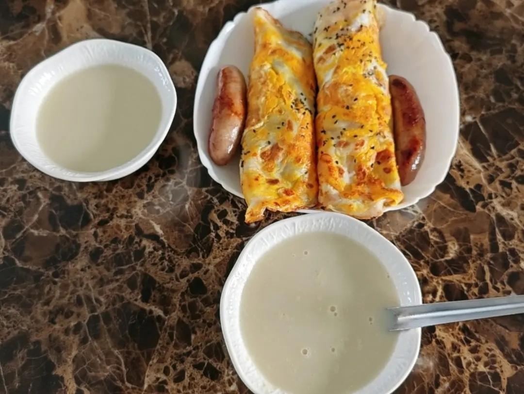 卷饼,鸡蛋饼,烤肠,燕麦豆浆