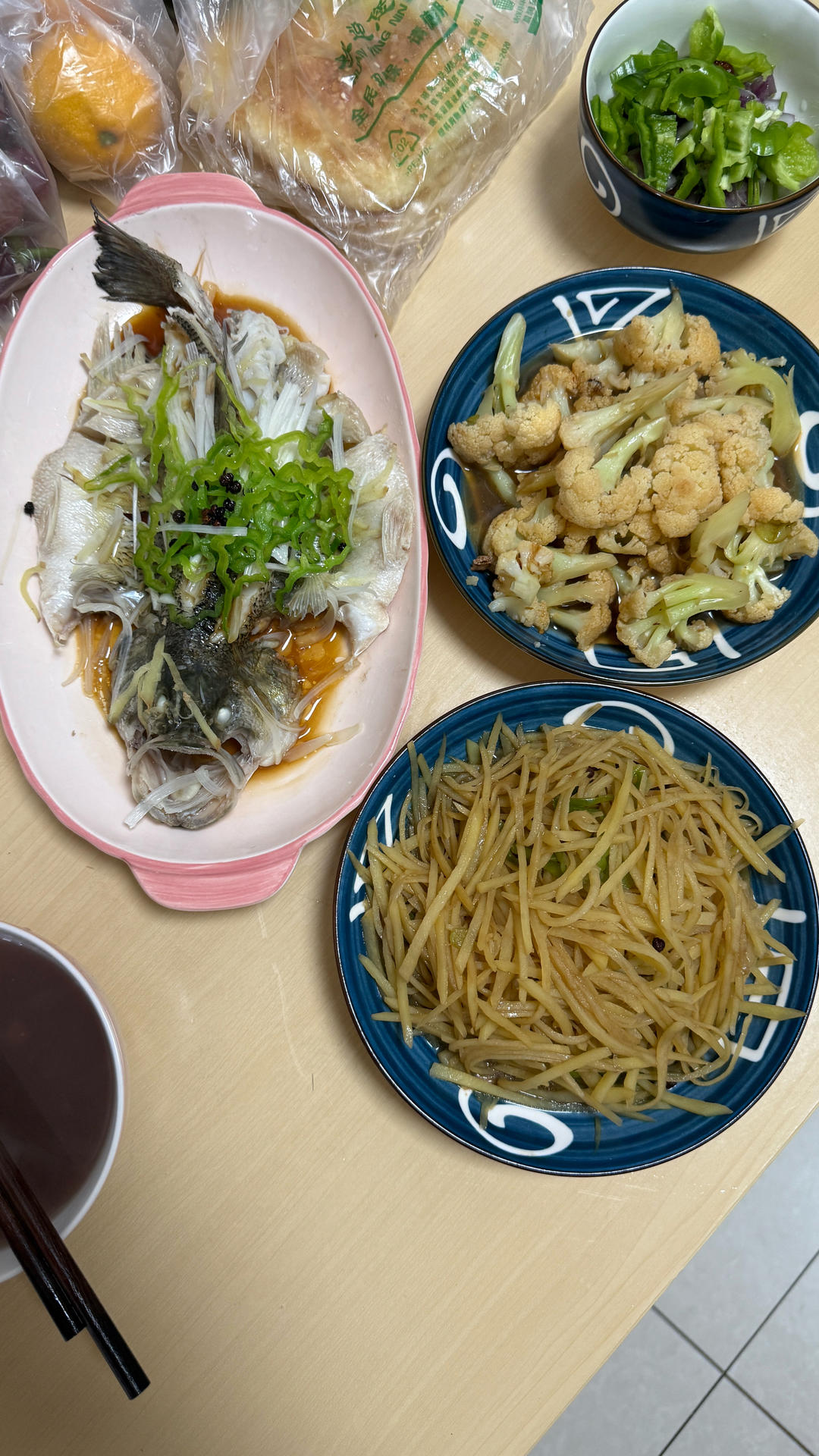 清蒸鲈鱼 醋溜土豆丝 牛肉酱炒菜花