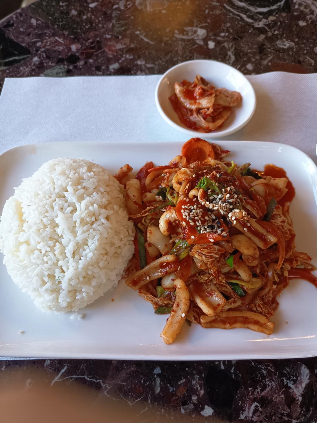苏黎世中午吃的韩餐鱿鱼泡菜套餐,鱿鱼味道有些淡,泡菜偏咸,不算很好吃