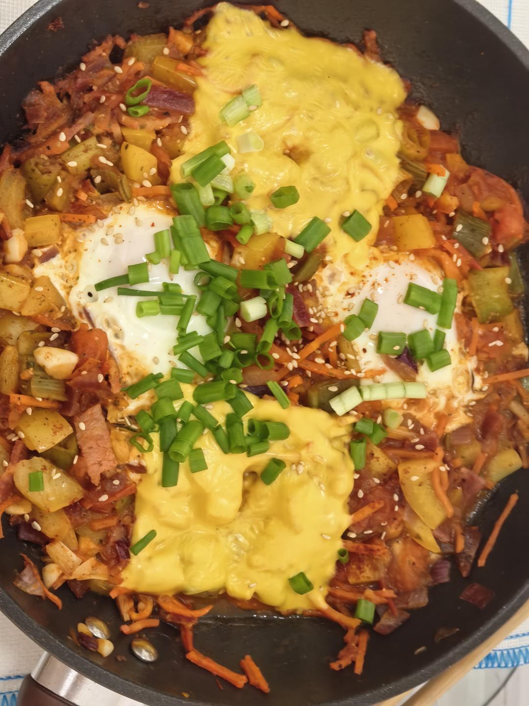 加了大葱爆香,又加了点胡萝卜和培根碎,最后加了两片芝士片,配着面包片吃光光了。很健康。...
