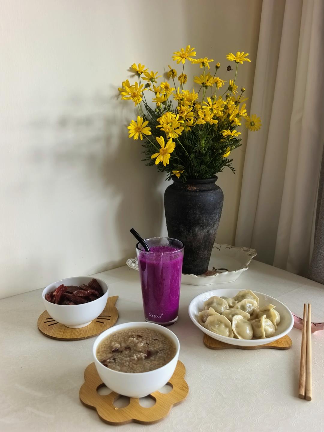 【早餐心语】小雪的饺子,大雪的面。一碗红枣杂粮粥、就着香菇猪肉馅蒸饺,还有香肠,还有自制火龙果奶昔,这么奢侈的早午餐,给...