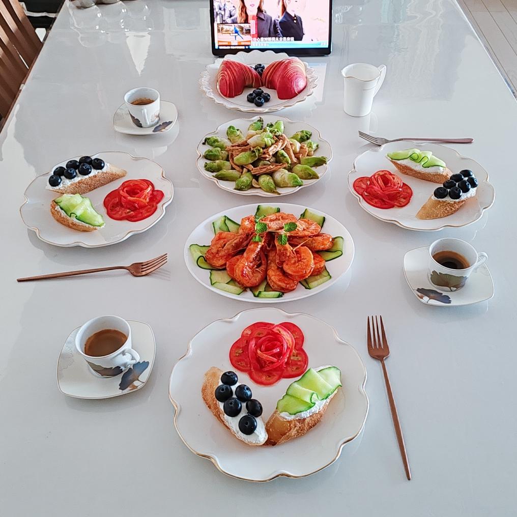 周末早午餐的正确打开方式:咖啡香裹着番茄虾的鲜,素炒腐竹儿菜,番茄雕成花、法棍搭酸奶蓝莓黄瓜开...