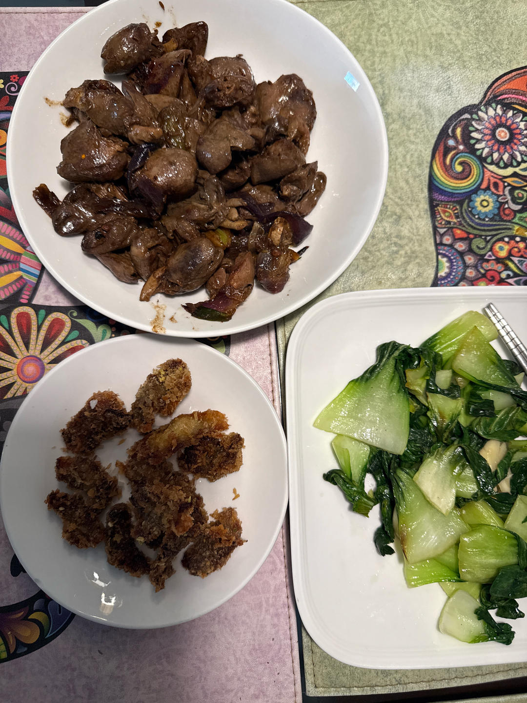 炸牛排 孜然鸡心 炒油菜