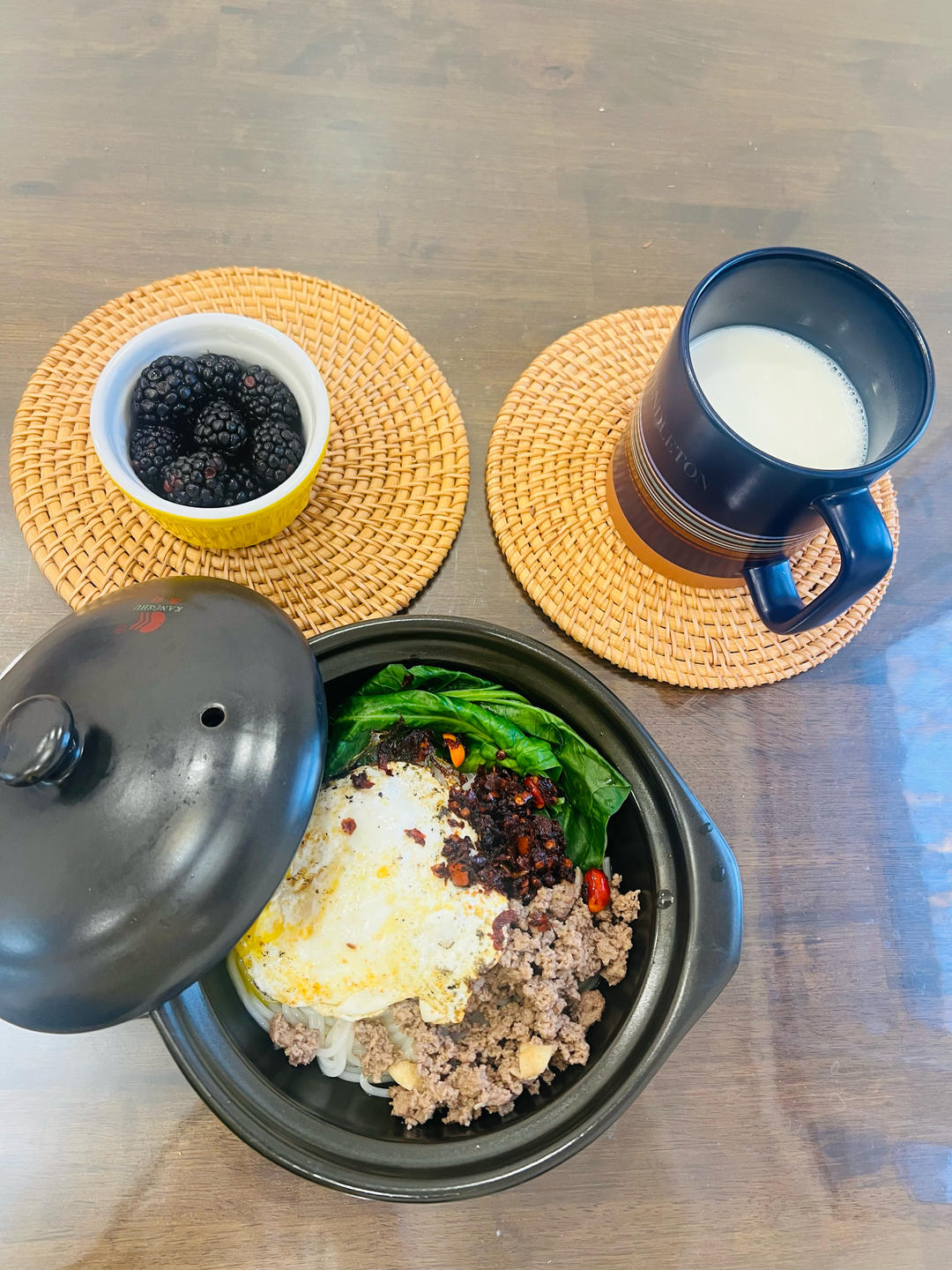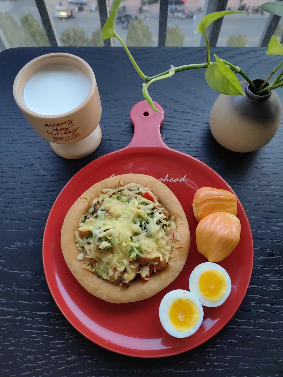 牛奶🥛+奥尔良鸡肉披萨🍕+鸡蛋🥚+菠萝蜜