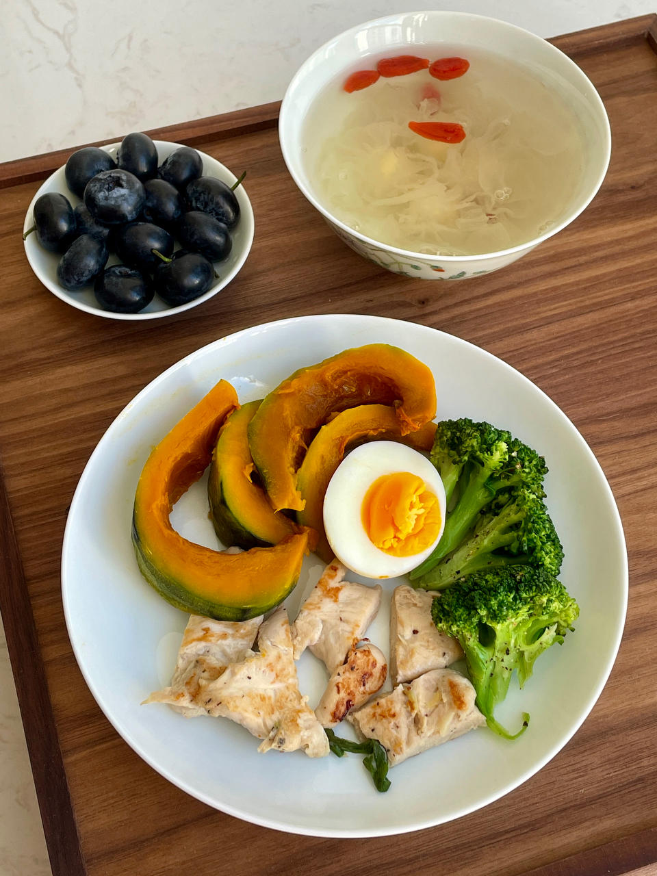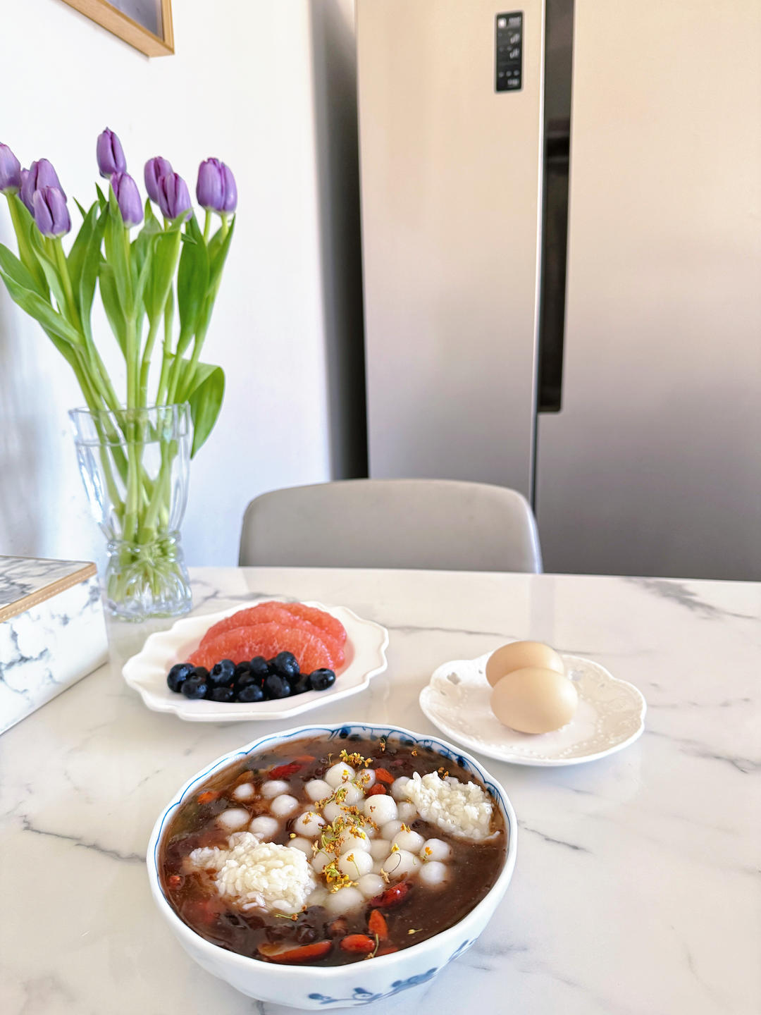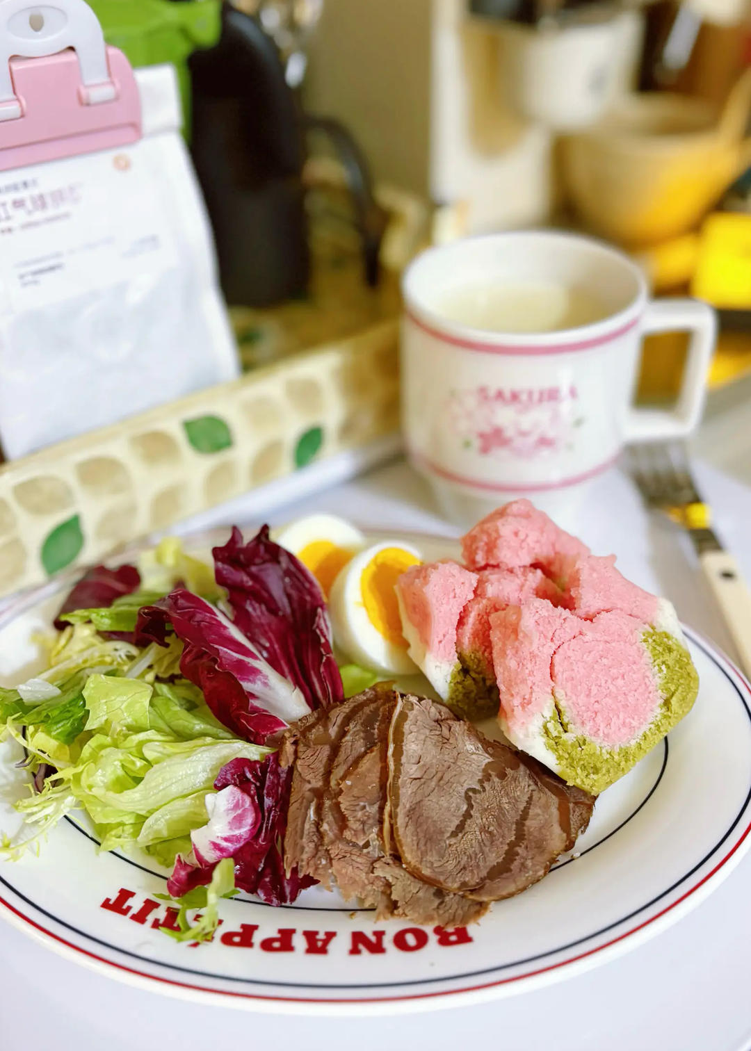 早餐打卡第一天:鸡蛋蔬菜沙拉、酱牛肉、三色米糕、豆浆。