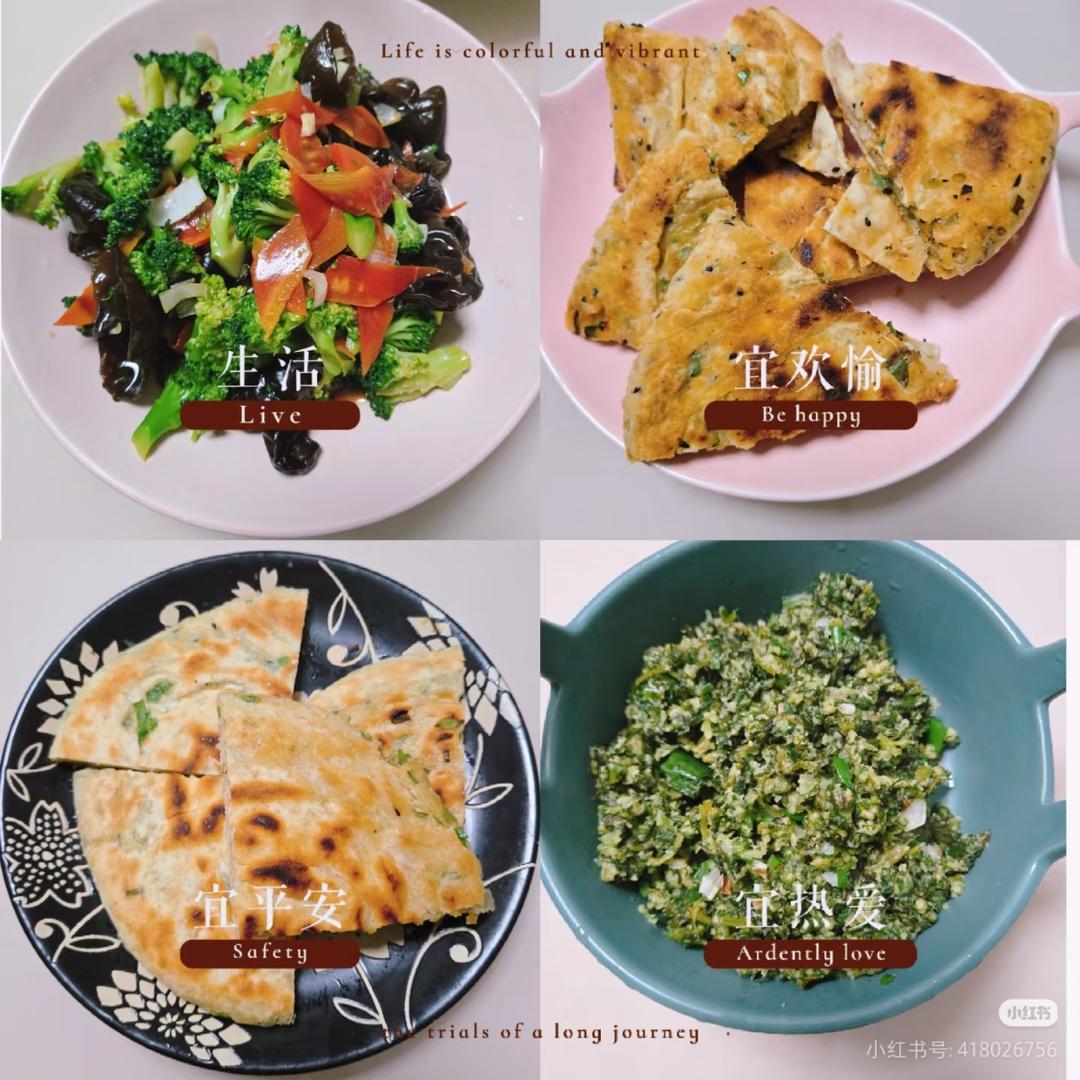葱花饼,西蓝花拌木耳,西芹麦饭