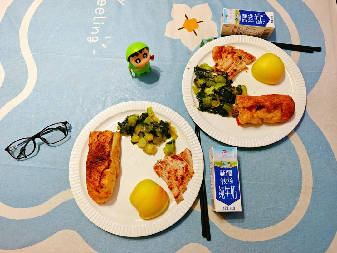 牛肉卷,炒青菜,鸡胸肉,苹果,牛奶