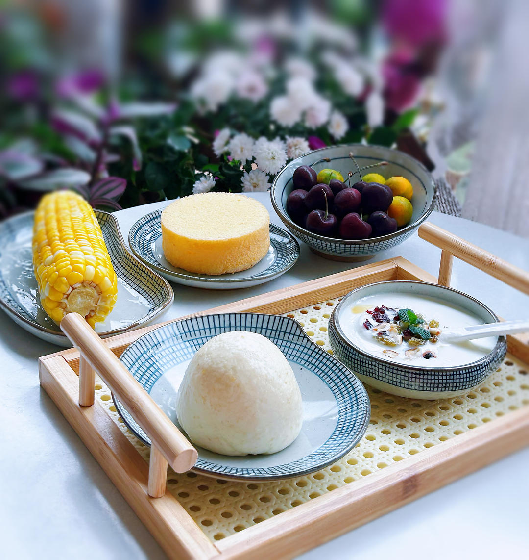 酸奶、燕麦馒头、蛋糕、玉米、车厘子、甜脆金桔