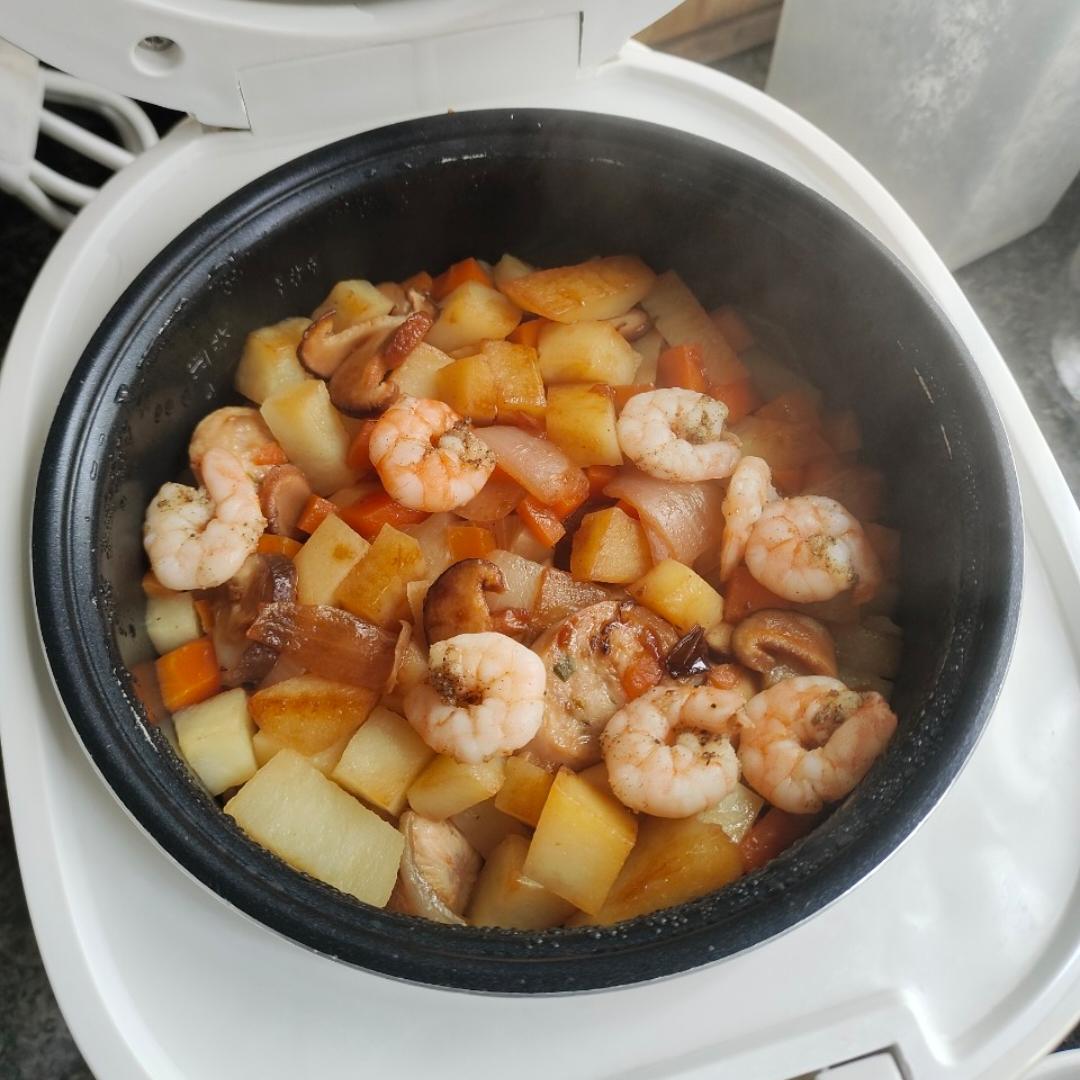 今天尝试的是先炒料再电饭煲