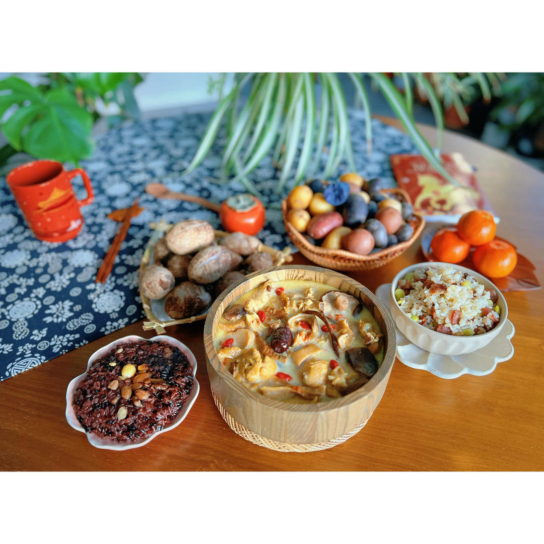 【猪肚鸡+腊肉蚕豆饭+蒸芋头+蒸彩色小土豆+八宝饭】
