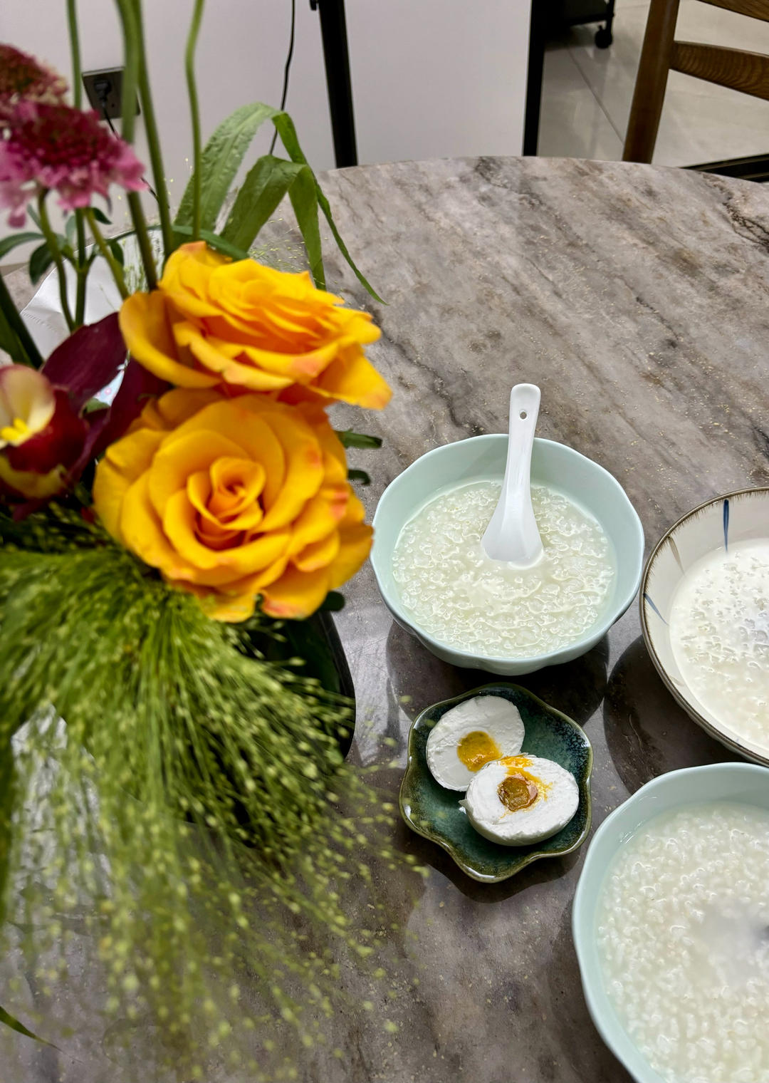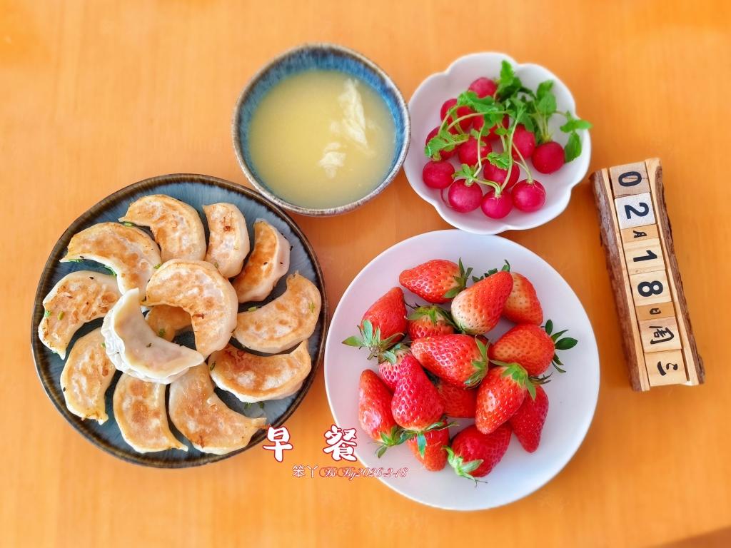 陪老太太拔牙回来,不管早晚,早餐还是要备好:胡萝卜鲜肉水煎饺,苞米面粥,樱桃小萝卜,草莓,蘸料被遗忘在镜头下了...