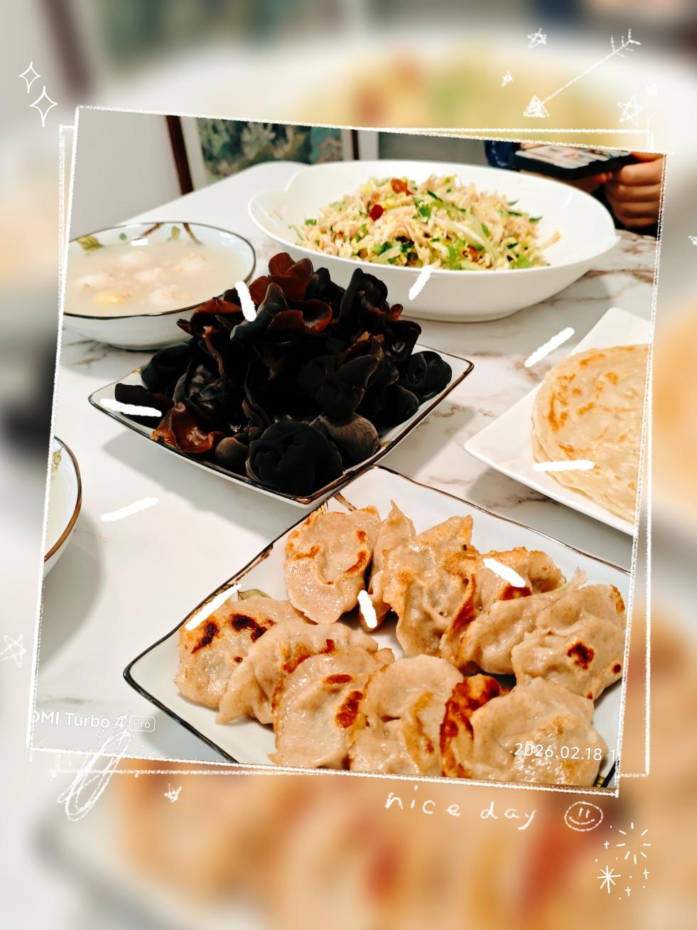 今日早餐:凉拌鸡丝黄瓜丝白菜丝、煎饺、麦片元宵、手抓饼、黑木耳。