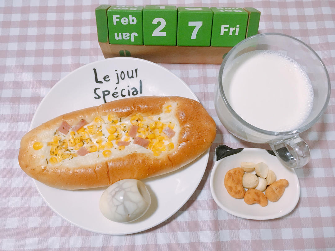 ㋁㏺放假第3️⃣0️⃣天 玉米🌽沙拉面包加茶叶蛋配牛奶🥛佐蟹黄腰果并夏威夷果