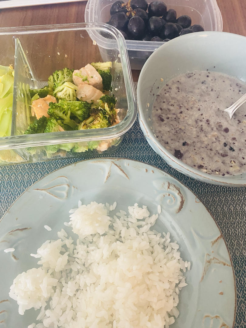 我的午饭 笋片鸡蛋 三文鱼西兰花 麦片桑葚豆浆 黑葡萄