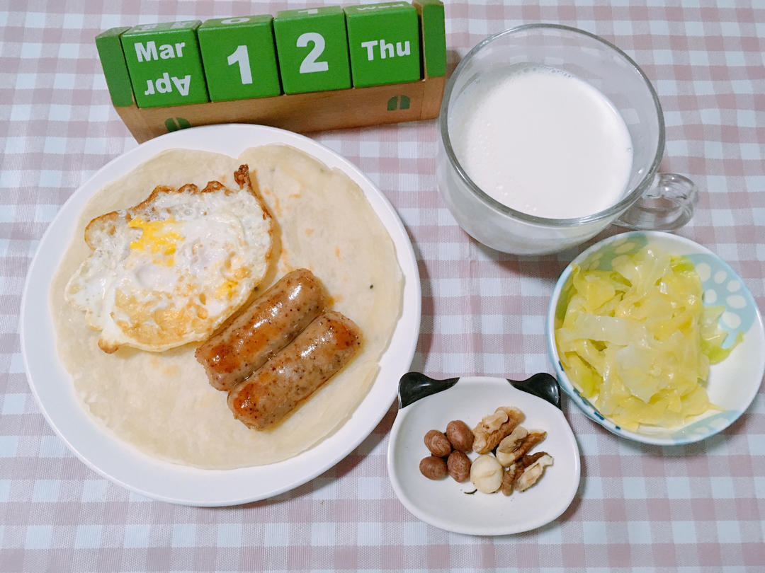 G9S2.W2Day4.煎蛋🍳手抓饼加黑椒烤肠搭麻油白菜配牛奶🥛佐榛子🌰并夏威夷果及核...