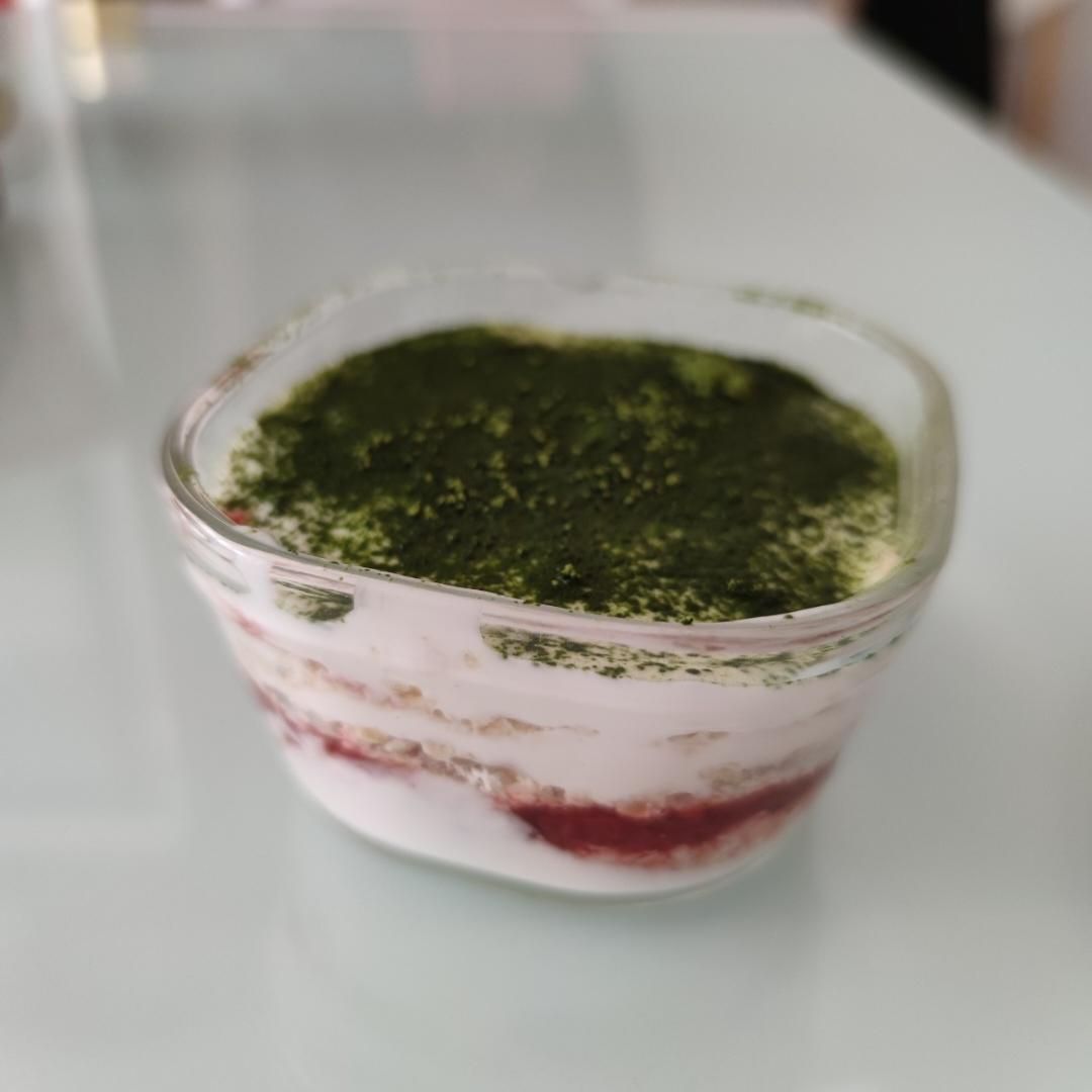 无糖酸奶+蒸糯即食麦片+草莓酱+麦片+无糖酸奶+抹茶粉