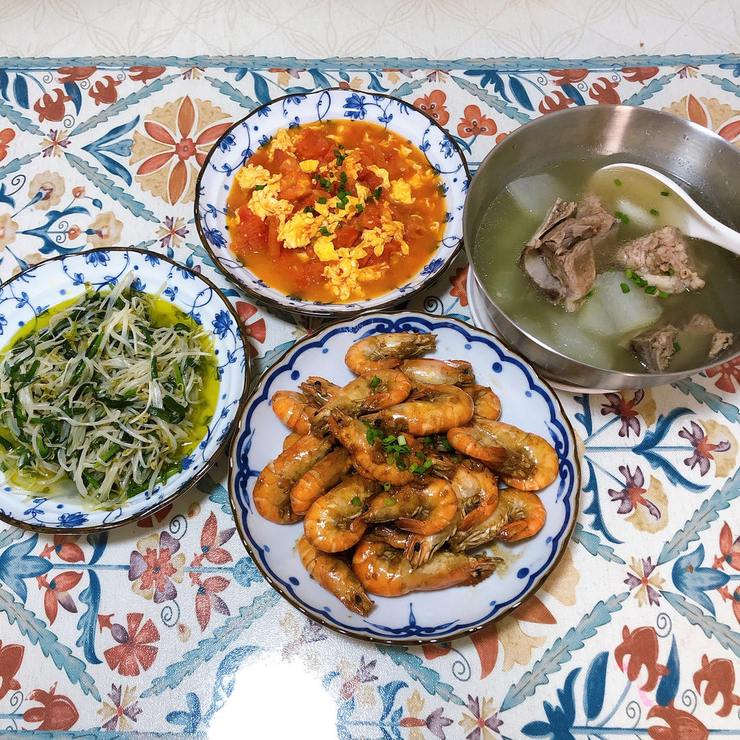 红烧罗氏虾,西红柿炒鸡蛋,绿豆芽炒韭菜,扇骨冬瓜汤外加白米饭