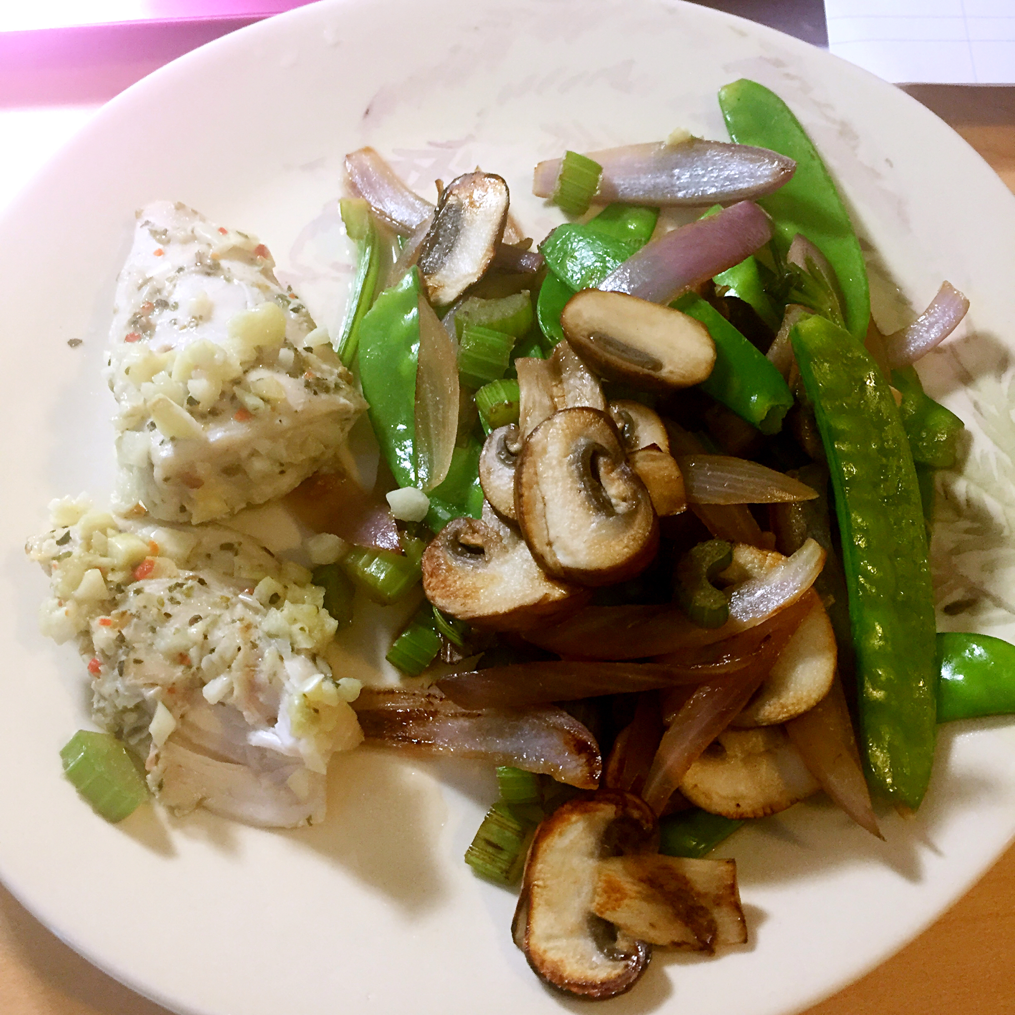 香蒜烤鸡胸肉,荷兰豆洋葱芹菜炒蘑菇,但是这种没吃饱的感觉是怎么回事