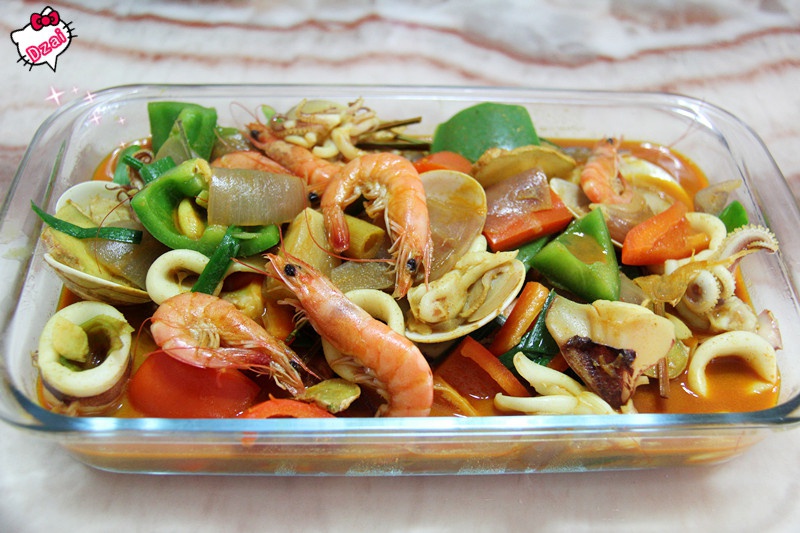 咖喱海鲜。用文蛤做底变得好鲜甜啊。还下了虾和小鱿鱼!!