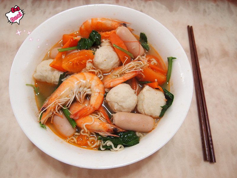 大紅蝦+鯊魚丸+親親腸+番茄+嫩芥藍菜。泡麵也可以很華麗麗!(廈門泡麵是真愛啊~不可替代的味道啊!!)#小佳Dzai的回...
