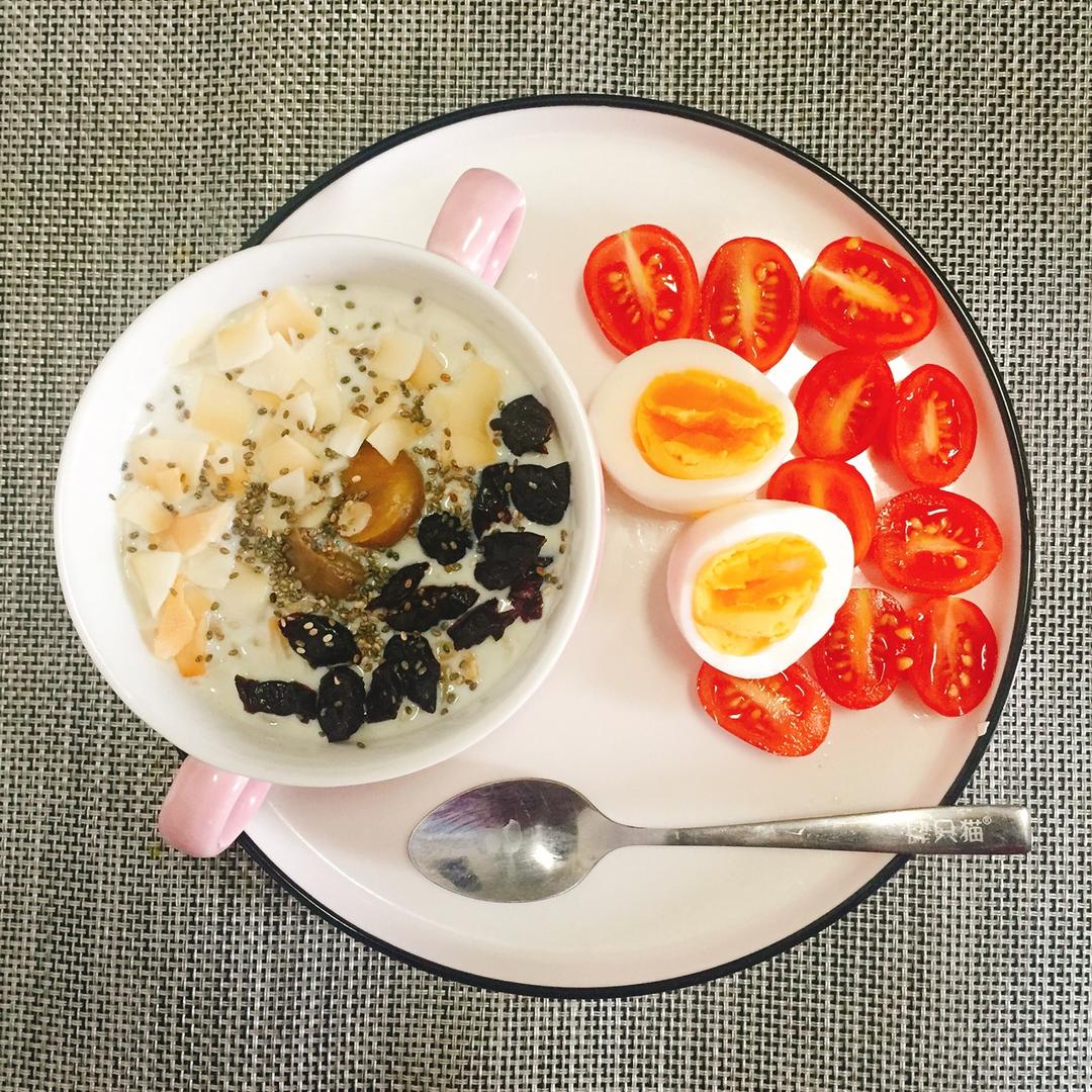 煮了牛奶栗子燕麦粥,撒了点椰子片和蔓越梅干