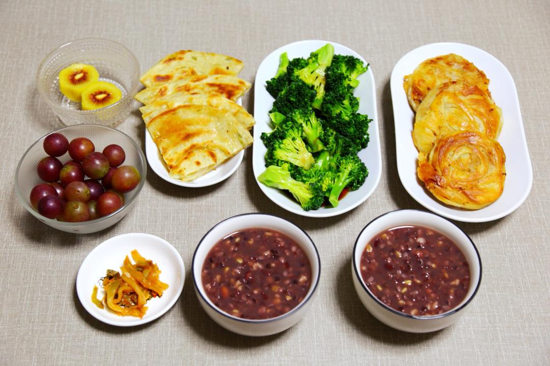 香酥肉饼+八宝粥+小咸菜+拌西蓝花+葡萄猕猴桃