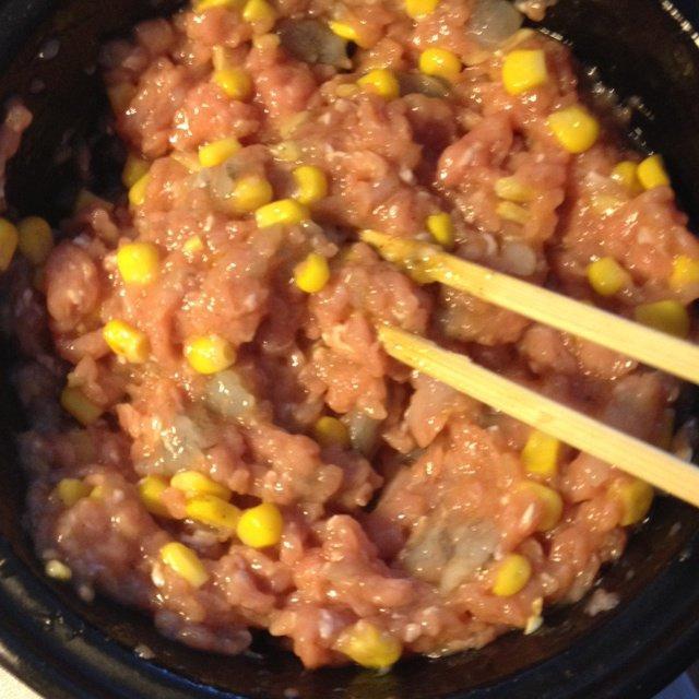 姜切细,越细越好。将鸡肉,虾,玉米,姜,一个鸡蛋混合。加糖,盐,蒸鱼豉油,胡椒调味。 盐要多放点。不介意的可以用筷子沾一点尝一下。要感觉到比平时吃的菜咸一点,煮出来才不会淡。肉馅里面可以加点油,这样肉馅不会柴。做好的馅如上图