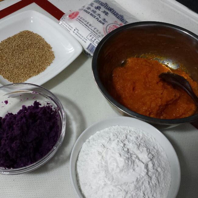 南瓜洗净,去皮去籽,切成小块,上锅蒸20分钟。蒸熟后,沥去多余水分,放在小盆里捣成南瓜泥。紫薯一同蒸熟,捣成泥备用。