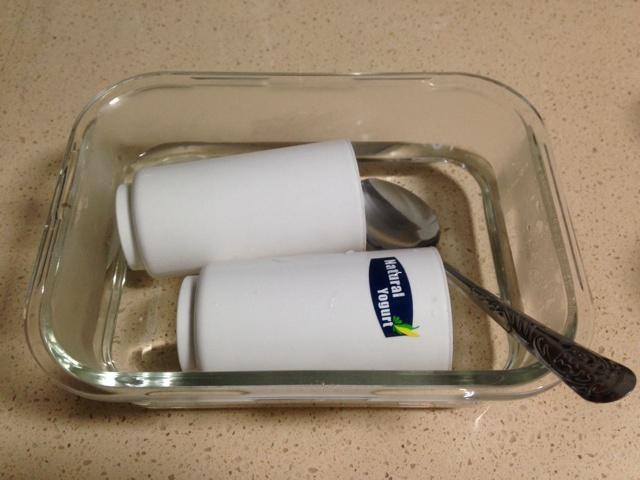 将开水倒入乐扣玻璃盒(或奶锅等耐热容器),里侧全部烫一遍,然后将4个塑料杯、搅拌用汤匙放入热水中浸烫消毒。