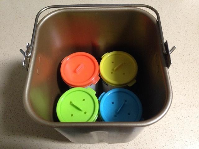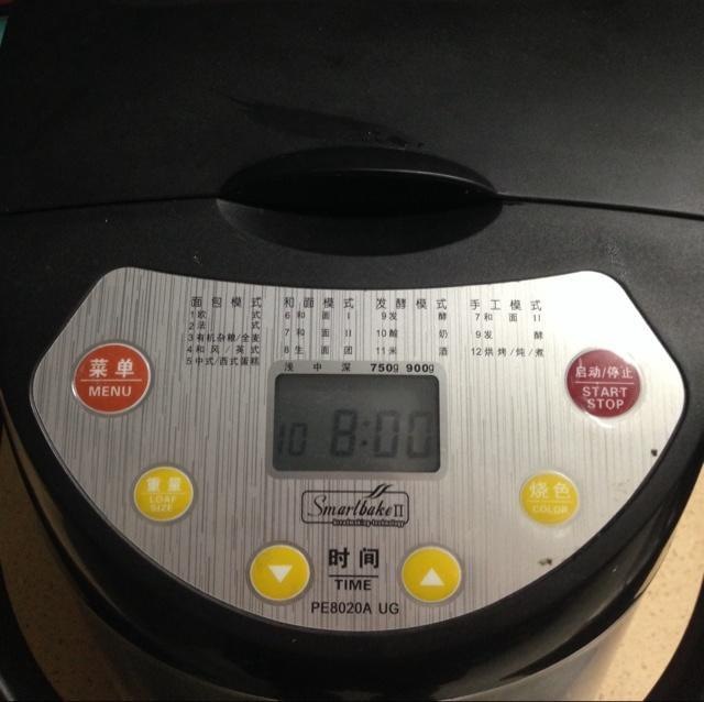 将面包捅放入面包机,关上机器盖子,通电,选择酸奶功能,时间设定为8小时,按开始键。