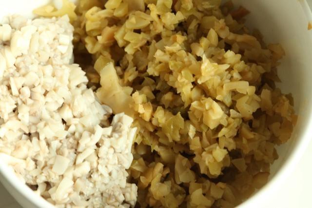 榨菜剁碎,蘑菇也用加了盐热水汆一下,然后剁碎