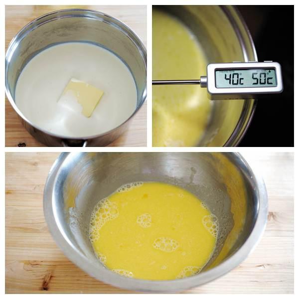 将黄油,牛奶,鲜奶油倒入锅中,加热至40°,然后倒入蛋黄糊中。木有温度计的同学肿么办捏?那就只能用手感觉了。我洗澡的水温一般在40°--42°左右,大家都应该差不多吧,所以手指感觉到的温度和洗澡水接近就可以了。